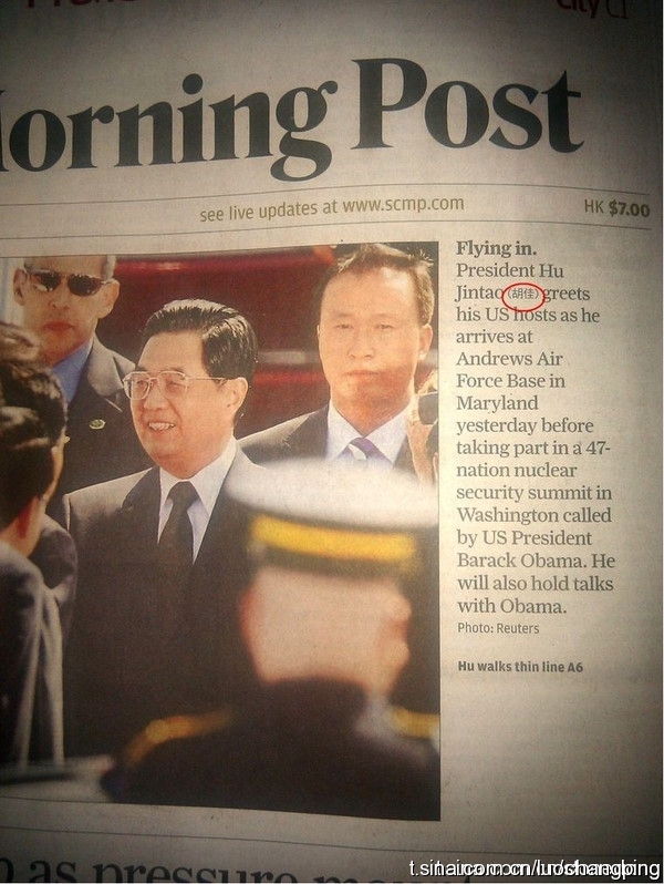 在《南華早報》的頭版報道中,刊登了胡錦濤抵達美國馬里蘭州安德魯空軍基地的照片,在相片的右側寫了相片說明「Hu Jintao(胡佳)」,錯譯了胡錦濤的名字,變成了中國維權人士胡佳。