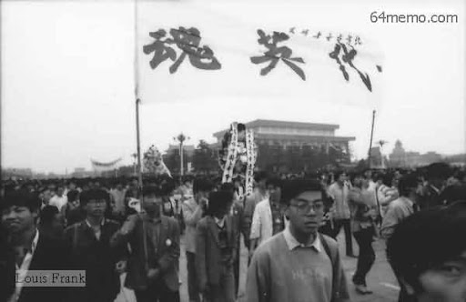 橫幅:「浴血民主」。北京工業大學學生高舉民主旗幟,星夜趕往天安門廣場,參加次日的悼念胡耀邦集會和請願活動。