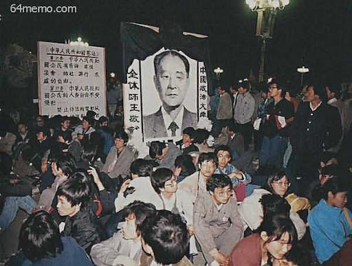 四月二十二日凌晨﹐北京大學生星夜趕往天安門廣場參加白天舉行的胡耀邦追悼會﹐激起了爭民主﹑反獨裁的浪潮。政法大學打出中華人民共和國規定公民權利的憲法條文。