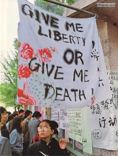 北大三角地是學運的主要發源地之一。在北京大學眾多的大字報中,有一張寫著美國革命時的一句口號:「不自由,毋寧死!」