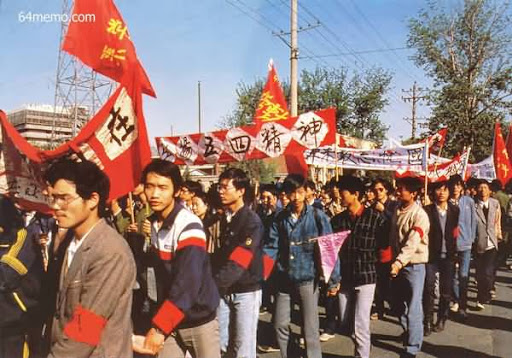 April 21st. Students from Beijing University of Engineering carried a banner, top reading "Democracy Bathed in Blood" as they marched into Tiananmen Square early Saturday morning to join tens of thousands of other students. The students planned to spend the night in the square and waited for the memorial service of Hu Yaobang later in the day.