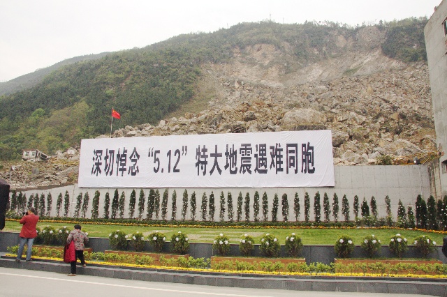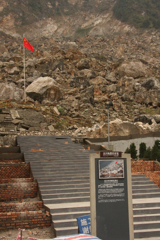 上图的上部是新北川中学初中部的遗址,5·12这天,学校整体全部被山崩的巨石覆盖,只有一个在操场上体育课班级的同学幸免。遇难者的遗体至今仍被巨量的山崩掩埋。在学校下方的那块草坪底下,集中掩埋了北川各处废墟中挖掘出来的遇难者遗体——故有“万人坑”一说,但据说真实数量是几千具。由于这里集中掩埋遇难者遗体,因此现在也是北川祭典遇难者的主要场所——现在定名为北川“遇难者公墓”。