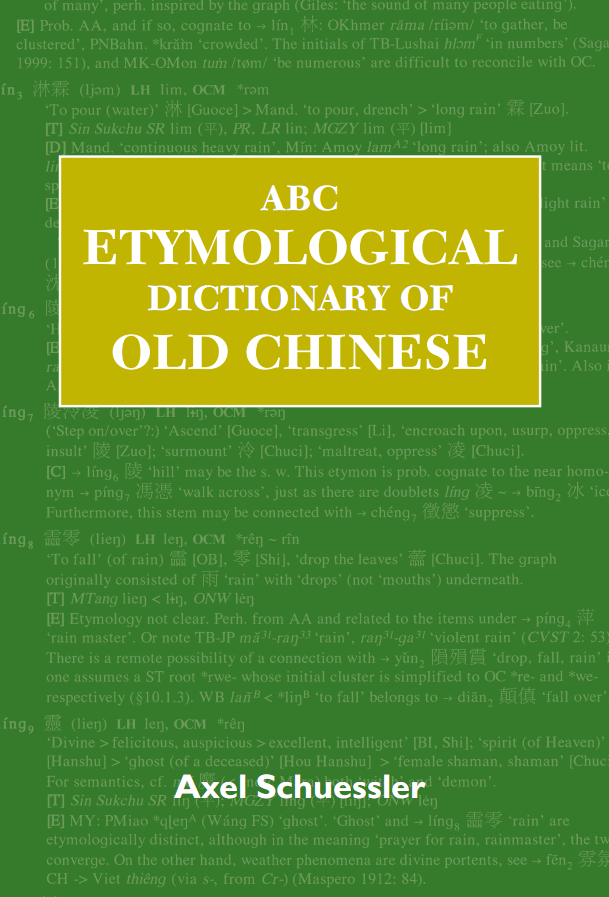 The ABC Etymological Dictionary of Old Chinese is a monumental achievement in the history of Chinese linguistics, offering many new hypotheses and systematically evaluating and incorporating earlier scholarship. It will be warmly welcomed by scholars in a wide variety of China- and Asia-related fields, including early Chinese language, literature, culture, and thought as well as the broader cultural-linguistic landscape of prehistorical East and Southeast Asia.