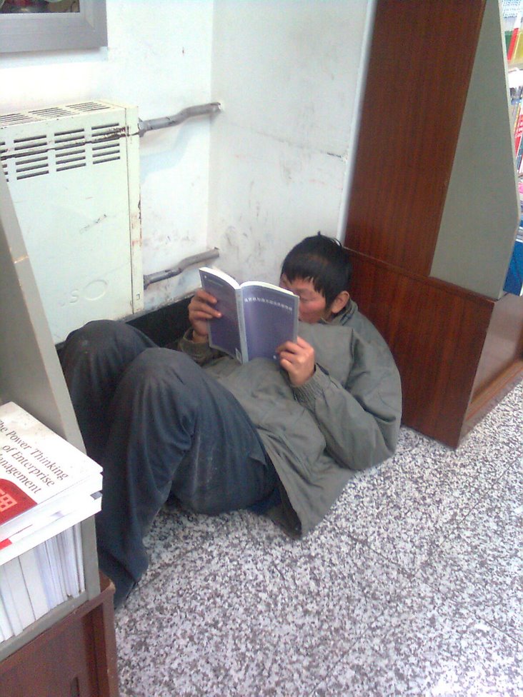 也许他的衣着不够光鲜、姿势不够优雅,但看书的神情绝对认真。