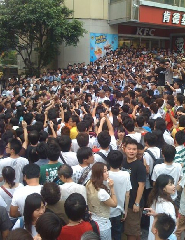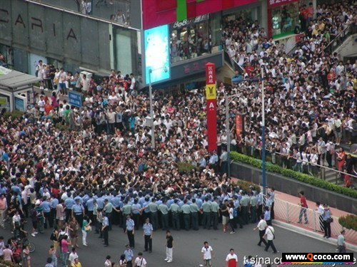 他們又指,今天大概已不可能賣「掉那媽,頂硬上」的T恤,但歡迎香港的朋友訂購。如有朋友有意訂購,可稍後電郵至inmedia聯絡。 Twitter 6:00pm @PKUsych 现场架起防护栏,警察正在尽力输送人群,劝大家回去洗洗睡吧!现场人群高喊,你们才应该回去洗洗睡! 江南西地铁站入口,江南西公路已经在管制,警察用三层人墙阻隔来自江南西北路的人潮。 大量普通警察退出,头戴钢盔,手拿防爆盾的防爆警察出现,与人群形成对峙。人群高喊叼你妈和 的口号!!! Twitter 5:30-5:45 @LEMONed: 警车也被堵在内环,警察下车跑下去了 @PKUsych: 现场人群高呼你 的口号,就是你老妈闭嘴的意思,我身边有位刚来不久的外地维稳警察,问我这个示威口号是什么意思。 @freemoren: 前方记者:一个代表举手喊口号,全场举手欢呼复合,警察傻比了想牵手围住群众结果全场大骂番龟之后又喊:)警察发现围错位置解散 @PKUsych: 广场人群在口号的指引下,向警察和推普竖出中指,高唱beyond的粤语歌曲! Twitter: 5:00 -5:30pm @freemoren: 前方记者:有人那出宣传纸丢那马顶硬上张全场亢奋斗现场多了起码三十个警察全场群众虚他们 @PKUsych: 现场热点转移,疯狂拍摄一位穿着言论无罪T恤的人,现场人越来越多,现在估计人比刚才要多出一倍。 @PKUsych: 警察试图逮捕身着言论无罪T恤的青年引发现场高潮,人群和警察发生肢体冲突,全程大吼放人,顶硬上等口号!!!! @PKUsych: 逮捕示威者的警察不过三到四人,很快便被多达千人的示威人群冲开,青年得救,现场爆发出雷鸣般的欢呼!! @PKUsych: 现在整个广场彻底被围的水泄不通,十分钟前还可以挪动,现在人挤人,像极了北京最高峰时期的地铁