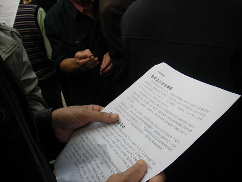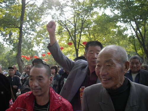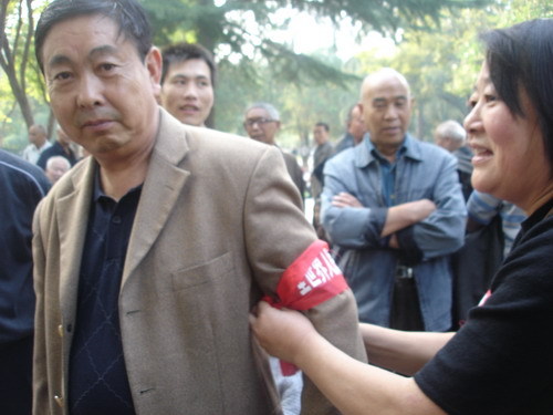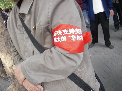 十月六号下午,郑州市劳动人民文化宫五一公园,市民举标语,带袖章,高呼口号支持美国“占领华尔街”。