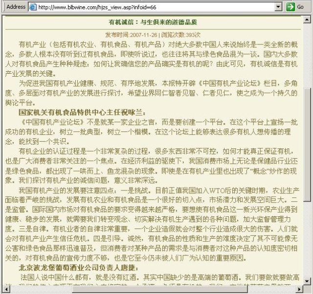 但是,网上还有一篇文章,是2006年3月15日科学网发表的记者李凡美的报道,题目是《北京波龙堡葡萄酒:有机就是诚信 》,http://www.wines-info.com/html/3/2006315121226109.html,写的是关于有机食品的一个论坛,第一个发言的就是“国家机关有机食品特供中心主任祝咏兰”,文末的括号中还清清楚楚地写到:“(本次论坛由国务院老干部活动中心、国家机关有机食品特供中心、中国未来研究会主办,由北京国佑万悦有机食品有限公司、北京波龙堡葡萄酒业有限公司、黑龙江北大荒农业股份有限公司八五四分公司协办。)”