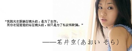 我们赞美老师,不因为她曾经带给过你我多少的愉悦,只为了,在这个不堪的年代,曾经有一具身躯,超越了阶级,超越了等级,公平的出现在每个人的视线里,她没有嫌贫爱富,没有官民不一,没有选择看她的眼睛!苍井空老师在这块土地上存在的意义不在于AV,而在于她无私的用自己的无论她穿着还是脱了的身体告诉大家,什么才是平等!如果这块土地上真有和谐,那么,这就是和谐!没有平等,永远都不会有什么和谐!
