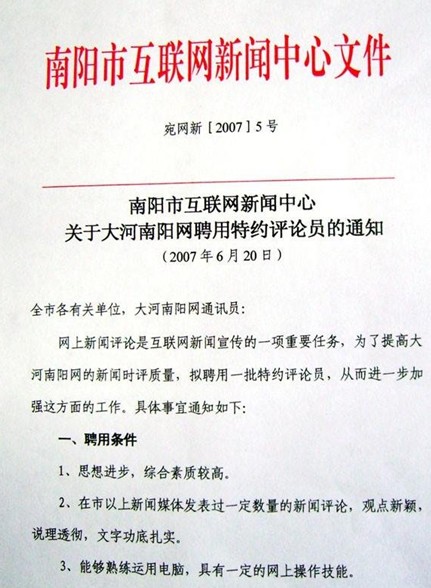 就在此时,各省宣传部开始正式聘用网评员,此举一时间被视为一项政绩工程,被大力宣传。