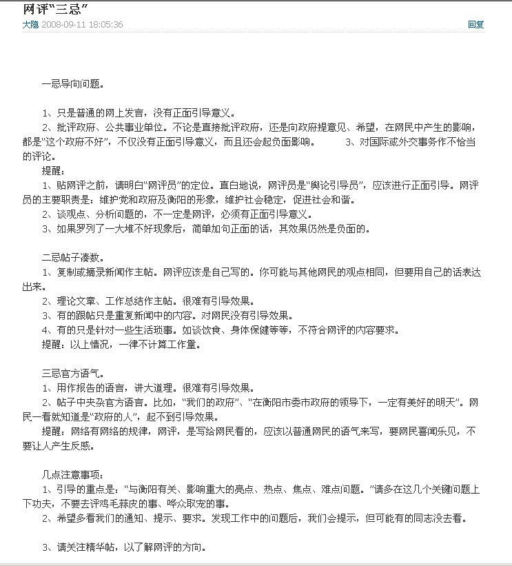 Several days ahead of China's 2008 National Day celebration, 20 commentators in Hengyang, Hunan Province were given an urgent assignment to write 1,000 posts on the discussion topic, "Emancipating minds and development of Hengyang." Local government leaders had solicited advice from netizens and wanted to counter any negative replies with positive comments.