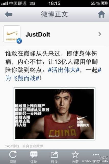 作者: qdpan 时间: 2012-8-8 17:32 标题: 神一般地耐克,1分钟内就发出这样的微博——连“单脚跳到终点”都蒙对了!
