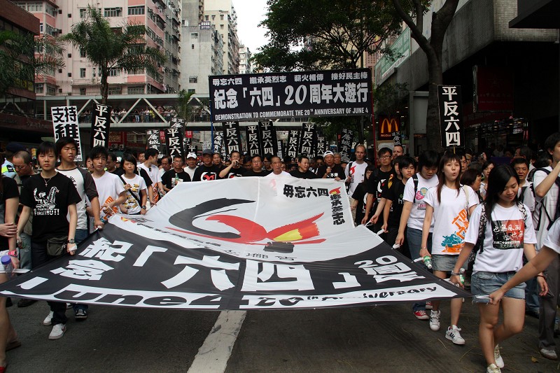 20年不想回忆的路, 8,000颗未能忘记的心;六四 20周年大游行,有 8,000人响应,创下 1992年以来六四游行人数新高。还有一项纪录,流亡海外的八九学运领袖熊焱今年加入带领游行,是香港首次有学运领袖参与的六四大游行。