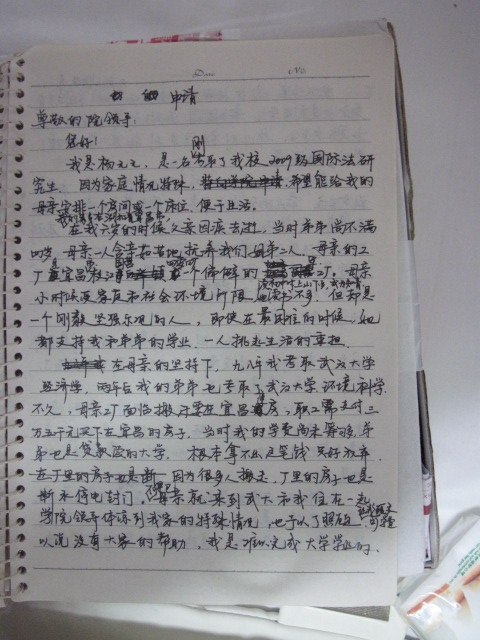 在母亲的坚持下,九八年我考取武汉大学经济学,两年后我的弟弟也考取了武汉大学环境科学。不久,母亲的工厂面临搬迁,要在宜昌建房,职工需支付三万五千元买下在宜昌的房子,当时我的学费尚未筹够,弟弟也是贷款读的大学,根本拿不出这笔钱只好放弃。因为很多人搬走,厂里的房子也是断水停电封门。不得已母亲就来到武大和我住在一起,学院领导体谅到我家的特殊情况,也予以了照顾,让我缓交了学费。可以说没有大家的帮助,我是难以完成大学学业的。
