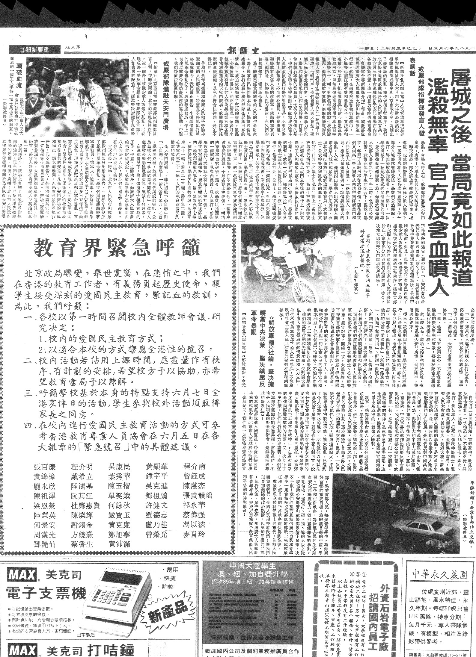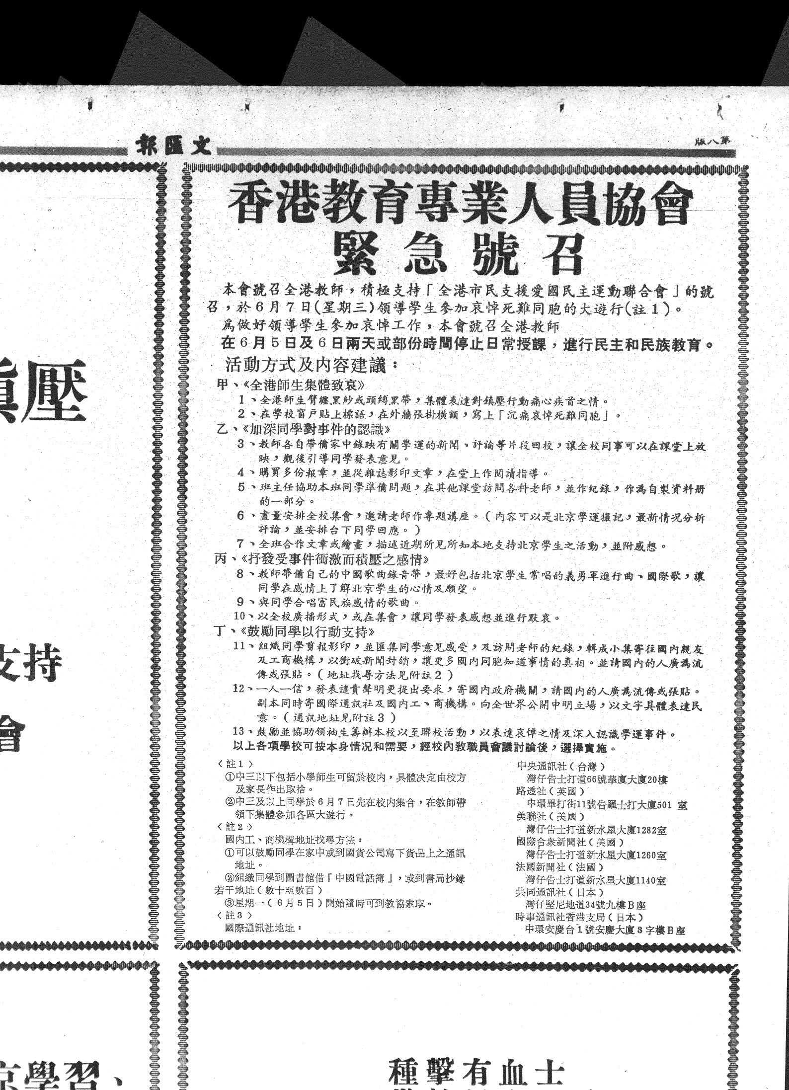 陳 雲 飛 因 兩 年 前 刊 登 了 一 則 小 廣 告 ( 紅 框 內 ) , 昨 日 再 被 拘 押 。