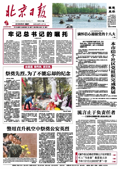 4月5号的《北京日报》在第1版刊发了特约评论员文章《牢记总书记的嘱托