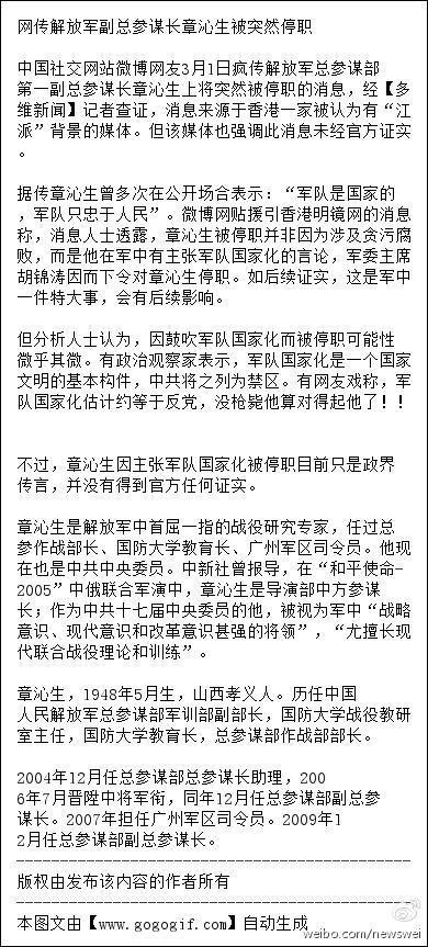 海外明镜网消息,中国共军副总参谋长、上将章沁生被停职,与此前落马的共军总后勤部副部长、中将谷俊山被停职原因"涉军队腐败"不同的是,章沁生是因主张军队国家化言论,传被军委主席胡锦涛直接下令停职,此消息目前未经中国官方证实。