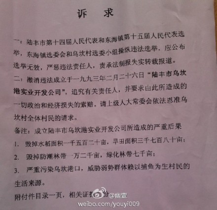 (转)《民众再一次觉醒了》:今天上午,广东陆丰乌坎上万村民走上街头,和平、理性地表达诉求。注意图最左边的两条标语。已经有二十2年没见到这样的公开标语了。
