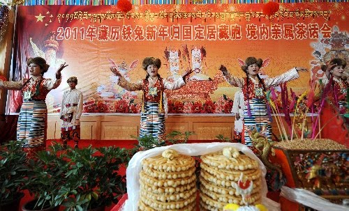 图为2011年2011藏历新年,西藏自治区统战部举办归国定居藏胞和境内亲属茶话会。(来自网络)