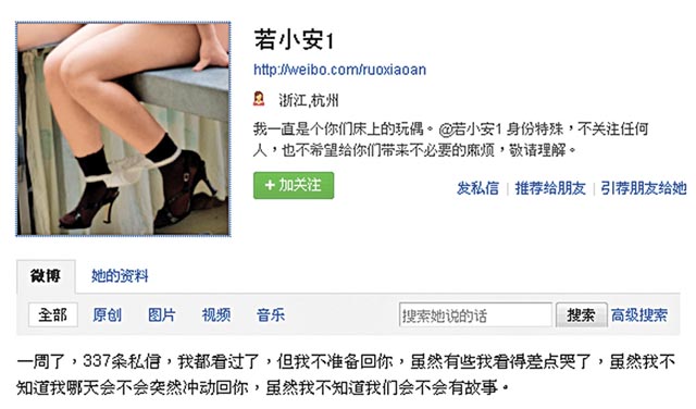 若小安是近月在网上走红的微博作者,她自称是失足妇女, 1989年出生,爱读书写作,希望做一位有思想、有文化的妓女。她常在微博上连载自己与不同男人的故事,曾描述第一个客人喜欢车震,而最特殊的客人是一位女人,还有喜欢看书的教授等。她说记不清邂逅了多少男人,但爱写下对每个客人的感受,获网民赞赏文采飞扬。