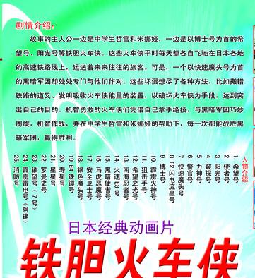 人家《铁胆火车侠》是:以博士号为首,希望号、阳光号等铁胆火车侠。这些火车侠平时每天都各自飞驰在日本各地的高速铁路线上,运送着来来往往的旅客。可是,一个以快速魔头号为首的黑暗军团却处处专门与他们作对……