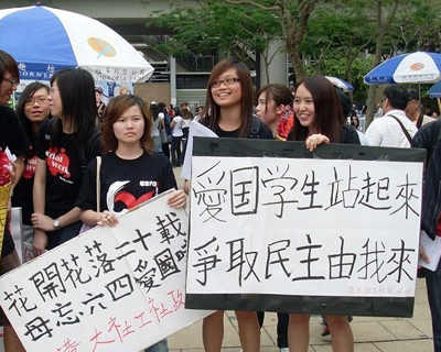 生于 88年的陈咏珊昨日担任游行龙头旗手,来自浸会大学社会学系的她察觉香港很多年轻人都不谈六四,觉得这件事与他们无关,她有点气愤:“六四镇压阻碍咗中国民主发展,如果香港人对中国民主进程着紧嘅话,就唔应该忘记呢件事。”