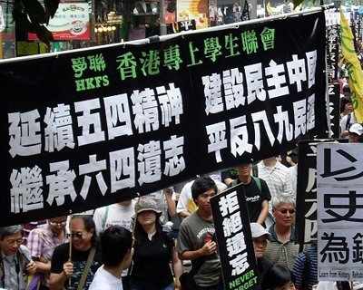 生于89年、站在队伍前方的两名彭同学齐指出,中国政府应面对和承担自己杀了人的事实,他们指自己是从家人口中和新闻中认识六四,过去的中学课程没有半点提及,他们又对曾荫权的“代表论”感到反感,声言他的言论并不能代表他们。