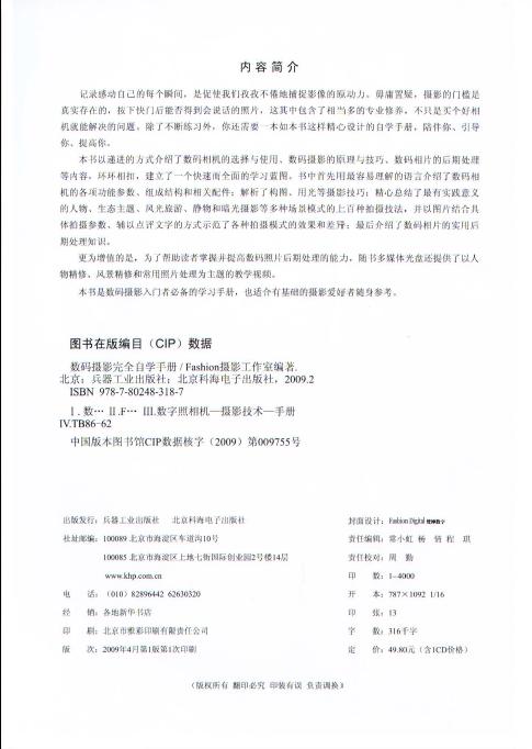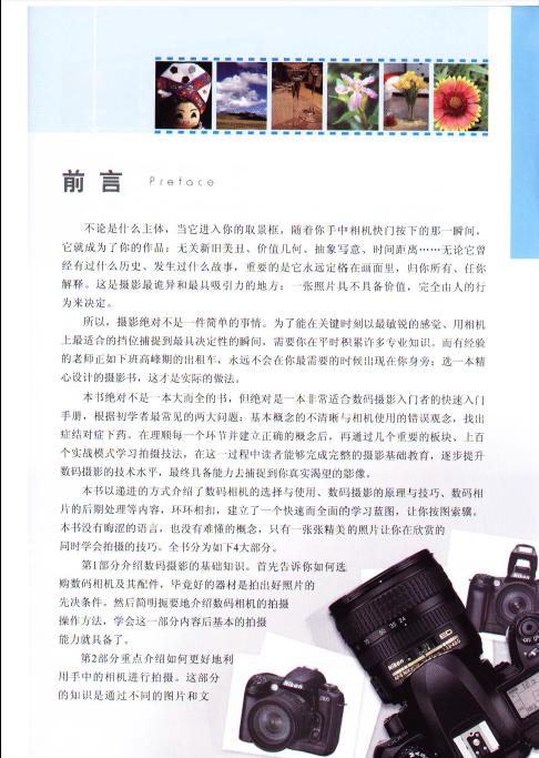 本书以递进的方式介绍了数码相机的选择与使用、数码摄影的原理与技巧、数码相片的后期处理等内容,环环相扣,建立了一个快速而全面的学习蓝图。书中首先用最容易理解的语言介绍了数码相机的各项功能参数、组成结构和相关配件;解析了构图、用光等摄影技巧;精心总结了最有实践意义的人物、生态主题、风光旅游、静物和暗光摄影等多种场景模式的上百种拍摄技法,并以图片结合具体拍摄参数、辅以点评文字的方式示范了各种拍摄模式的效果和差异;最后介绍了数码相片的实用后期处理知识。