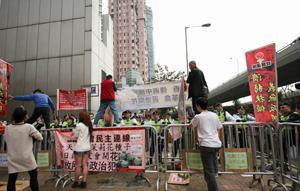 几十名民主活动人士星期天早早来到北京中央政府驻香港联络办公室附近扎棚。他们带着支持中国茉莉花革命的标语牌,和一盆一盆的茉莉花,准备将茉莉花种在中联办大楼前的花园内。与此同时,人数超过抗议者几倍的香港警察用铁栅栏阻挡示威者,不让他们接近中联办大楼。