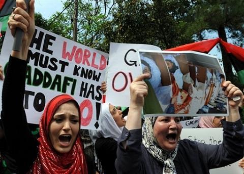 2月23日抗议人群在利比亚驻科伦坡大使馆外高呼反对卡扎菲口号