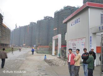 在被严重摧毁的都江堰市已经造起了61000所房屋。3000个家庭将搬进新居。国家建筑公司的唐天学说:"开建的时间是08年9月。截至到现在,我们这里的小高层部分已经基本封顶了。竣工时间在09年12月以内。多层部分要全部竣工。明年512之前房子要全部交付使用。"