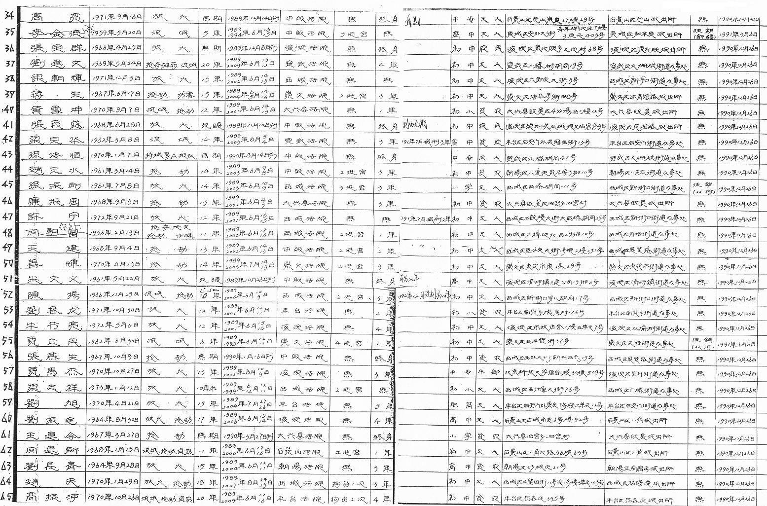 这是狱友在九十年代初期,从北京第二监狱的某办公室的墙上揭下的所谓“暴徒”名单。上面详细记载了104人的“罪状”、刑期及个人的家庭情况。