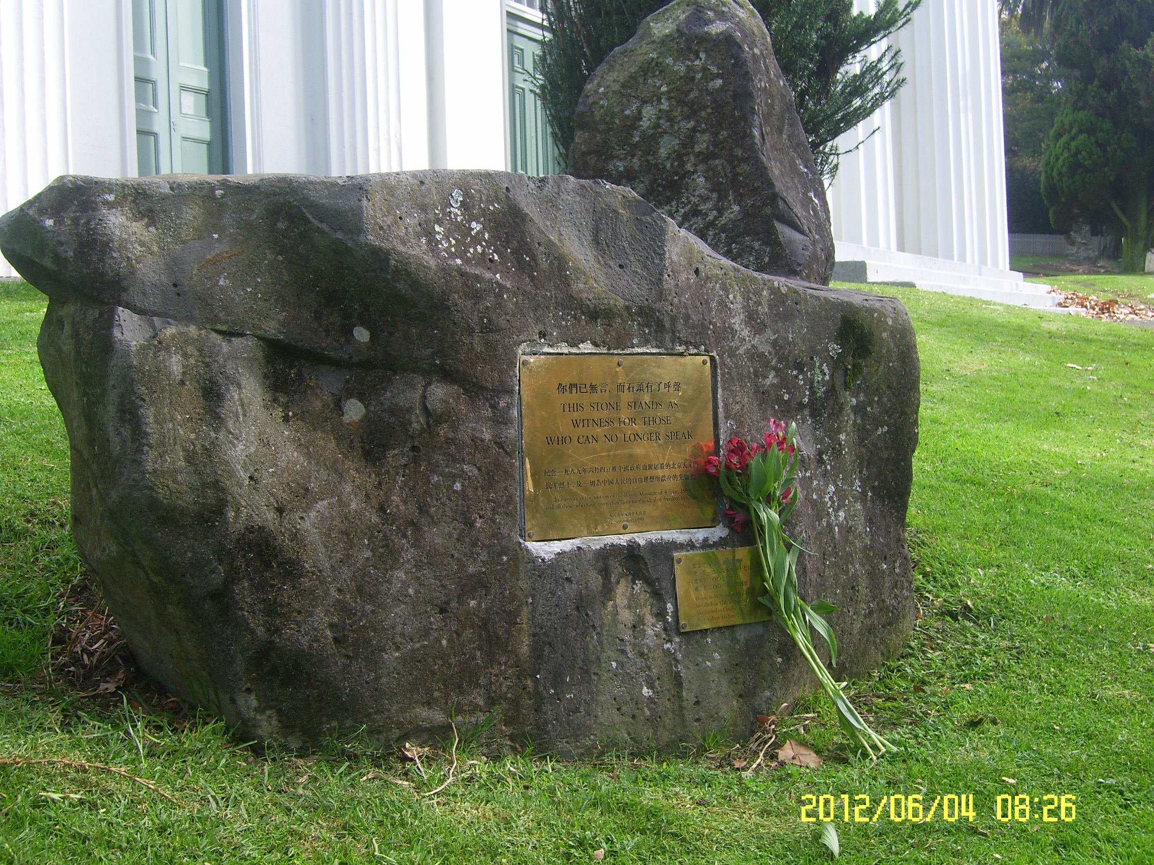此碑于一九八九年九月十七日始立于St Andrew's Presbyterian Church ,  at the corner of Symonds Street & Alten Road, Auckland City. 奥克兰大学的音乐学院区.
