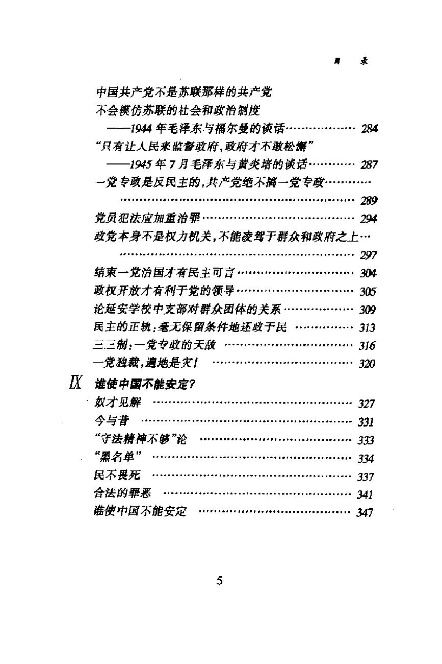 目前推行民主政治,主要关键在于结束一党治国。......因为此问题一日不解决,则国事势 必包揽于一党之手;才智之士,无从引进;良好建议,不能实行。因而所谓民主,无论搬出何种花样,只是空有其名而已。
